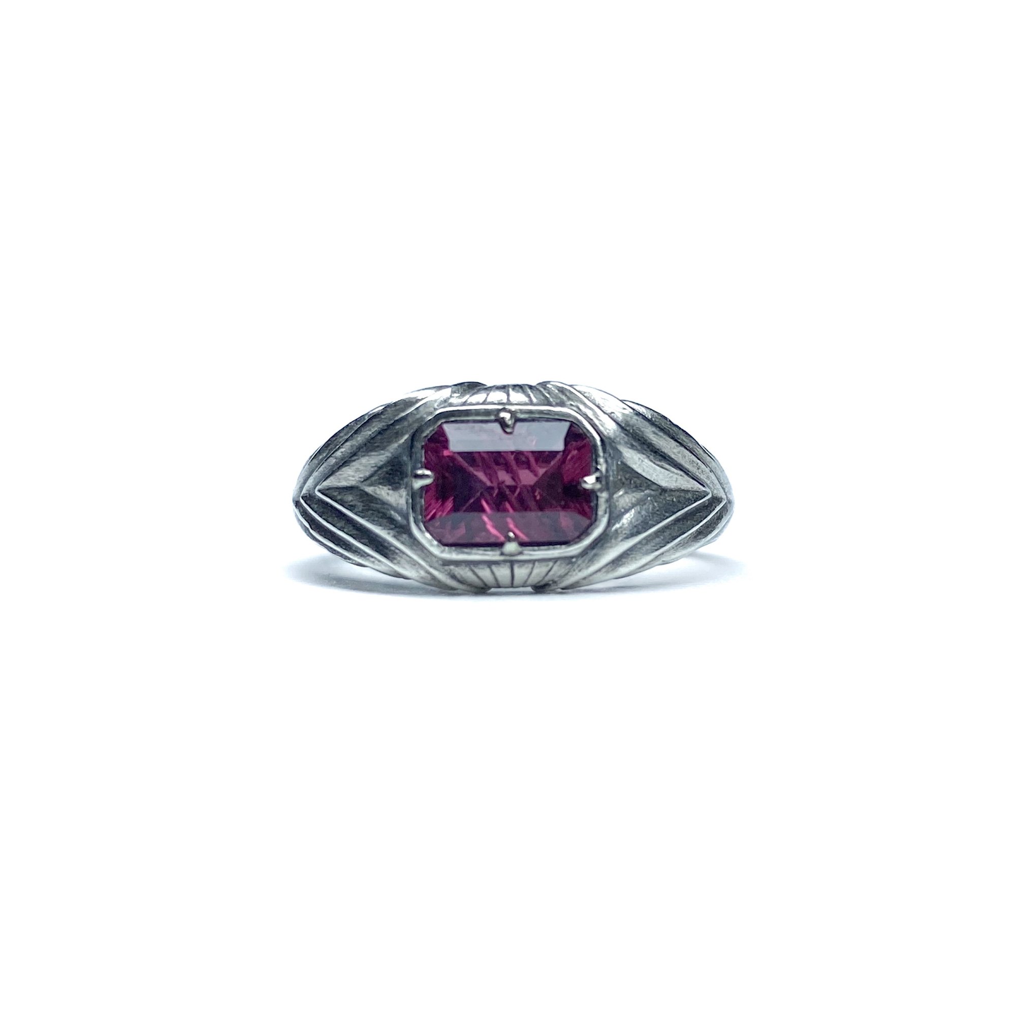 Originally hand carved in wax, this intricately detailed design is cast in your choice of sterling silver, 10k gold, or 14k rose, yellow, or white gold. It is set with a natural, ethically sourced rectangular stone measuring 7mm x 5mm.