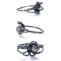 A black widow spider patiently sits, her legs curled around her. Cast in your choice of sterling silver, 10k gold, or 14k rose, yellow, or white gold.