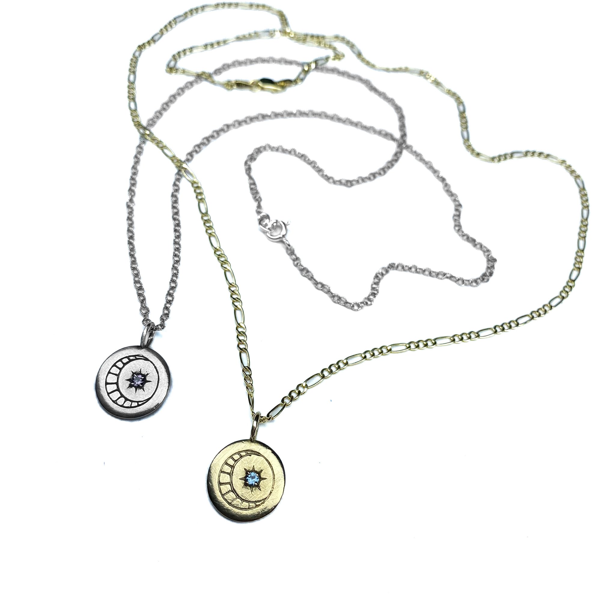 Inspired by Victorian mourning jewelry, a small round disc featuring a simple crescent moon and star is suspended from a 2mm cable chain. Cast in your choice of solid sterling silver or 10k gold and set with a rose cut salt & pepper diamond or an ethically sourced blue or lavender spinel.