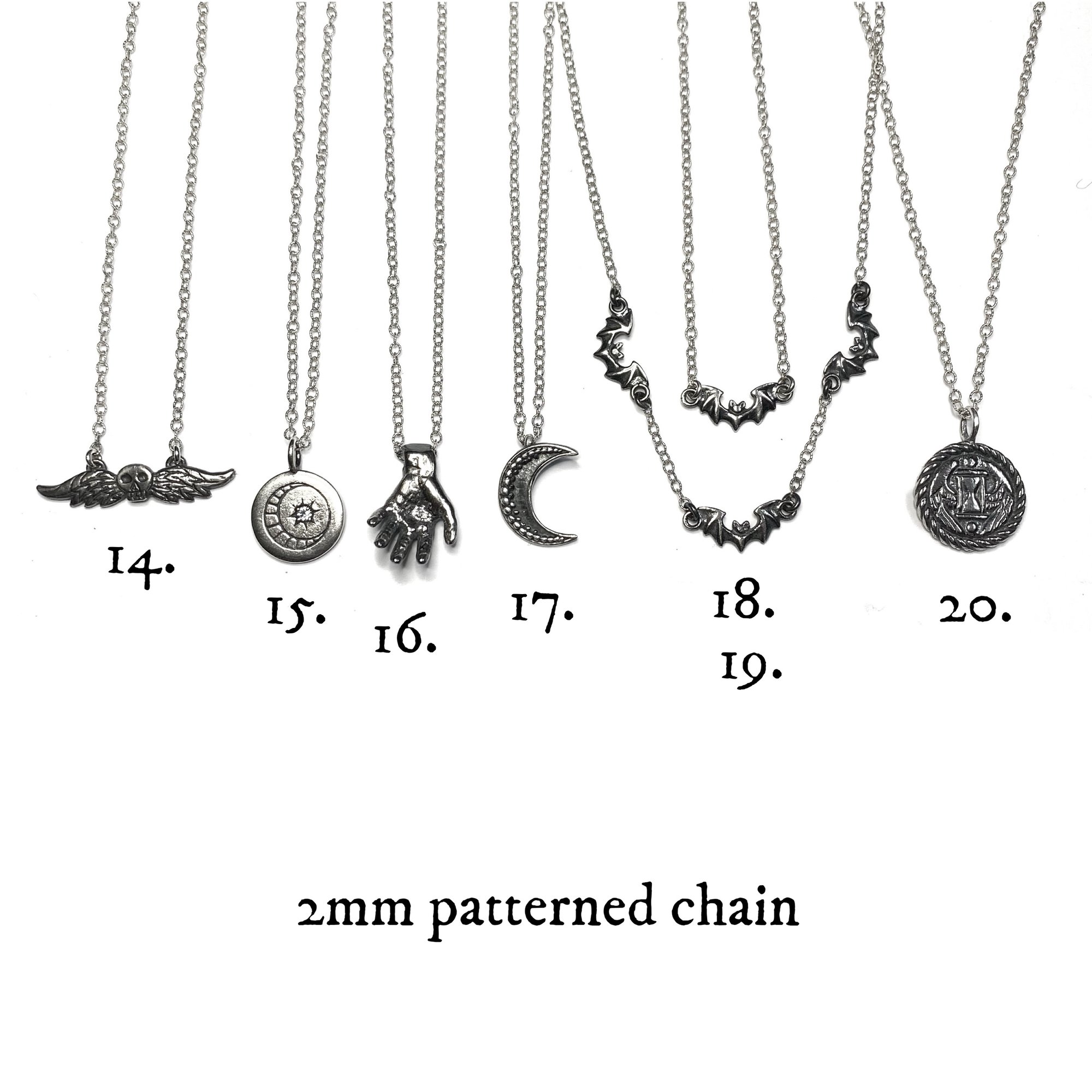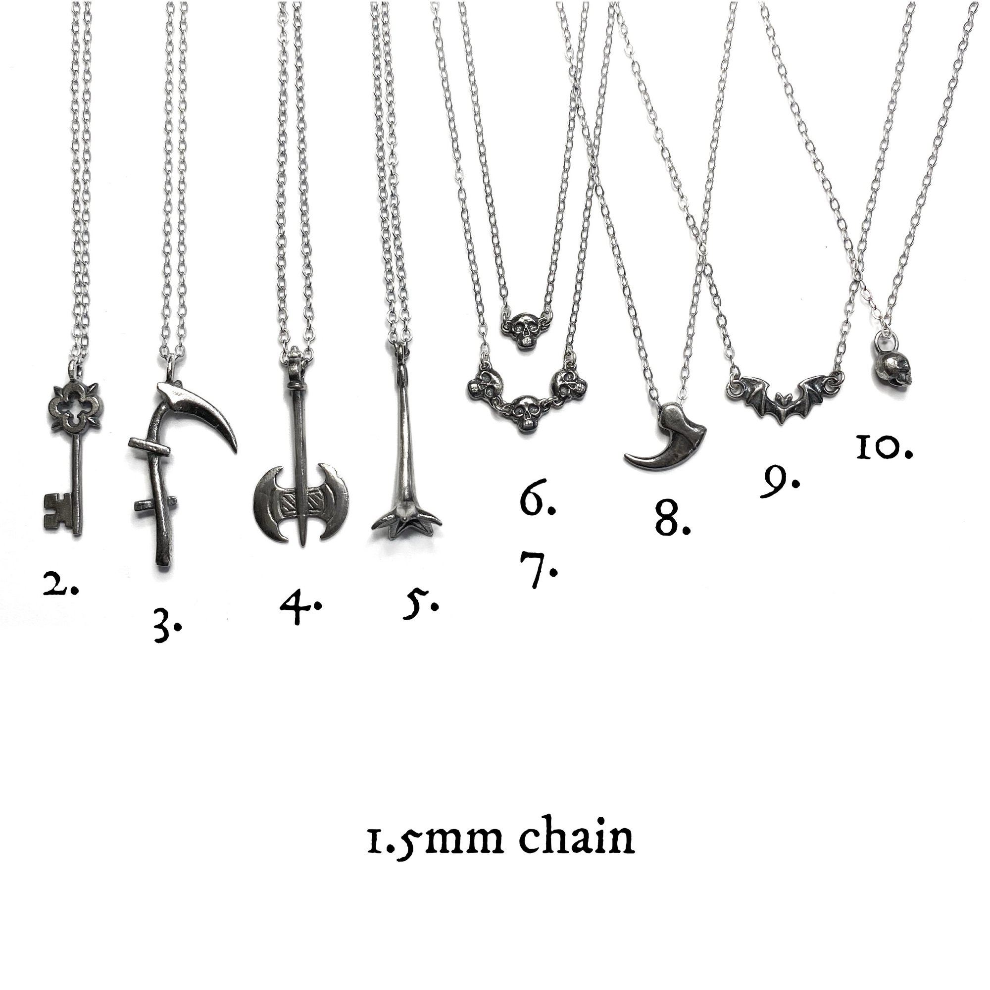 3. Mini Scythe, blade up, 1.5mm partially oxidized oval cable chain