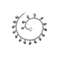 Tiny, three dimensional skulls, originally hand-carved in wax and cast in solid sterling silver that has been partially oxidized, dangle from the links of a 3.1mm sterling silver patterned oval cable chain.